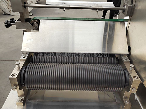 將混合、煉制均勻的藥料膏坨送入制丸機(jī)料斗中,通過(guò)翻板翻轉(zhuǎn)擠壓,在推進(jìn)器的作用下,藥條由兩側(cè)料嘴擠出。當(dāng)藥條到達(dá)一定長(zhǎng)度時(shí),由自動(dòng)切刀切斷,再由分配器將藥條送入搓輥。輥刀的位置和輸送帶松緊可分別通過(guò)微調(diào)裝置進(jìn)行調(diào)整,改變丸粒大小和重量可通過(guò)更換相應(yīng)規(guī)格的制丸刀輥實(shí)現(xiàn),操作方便。